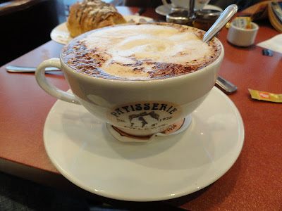 Patisserie Valerie. Greg and I shared a chocolate croissant, apple porridge and freshly baked scones. We had delish cappuccinos to drink.